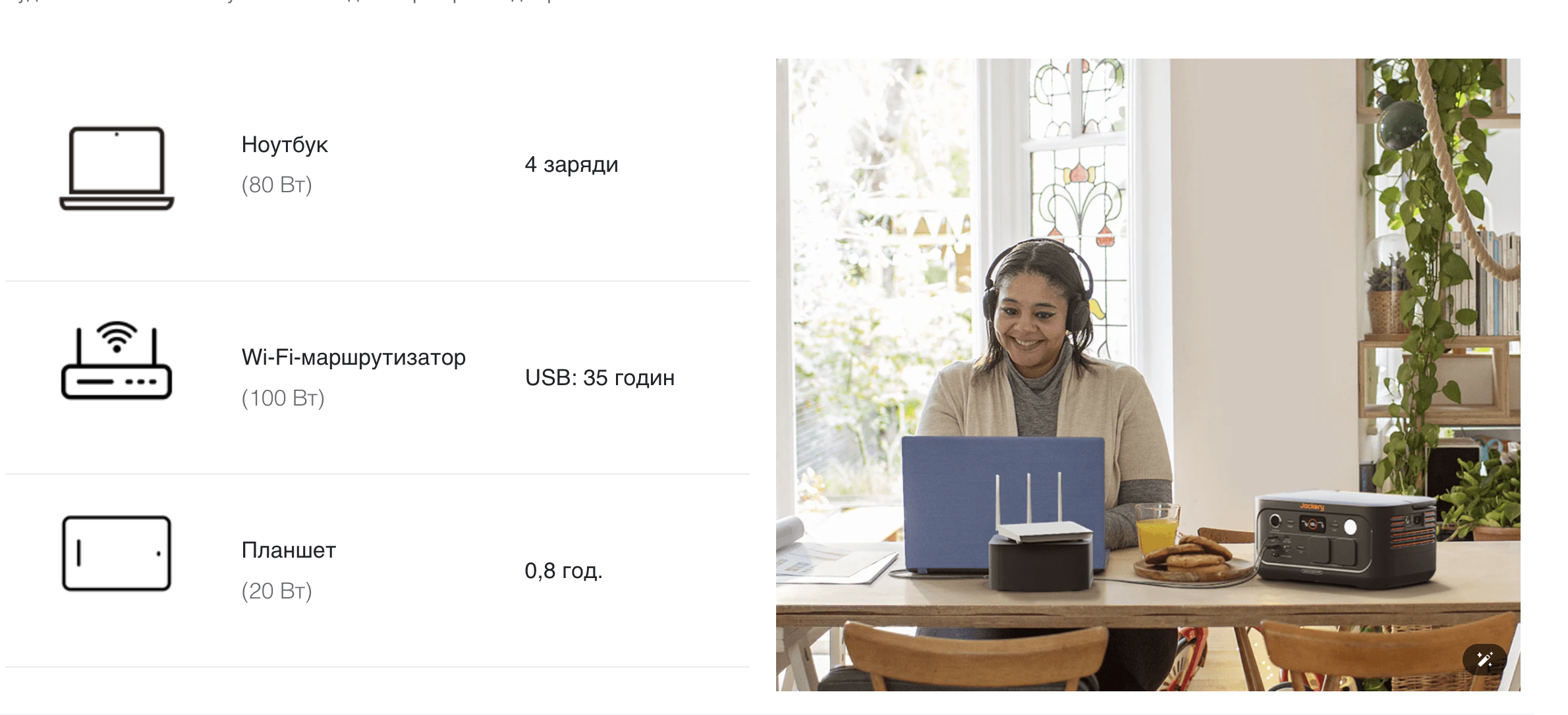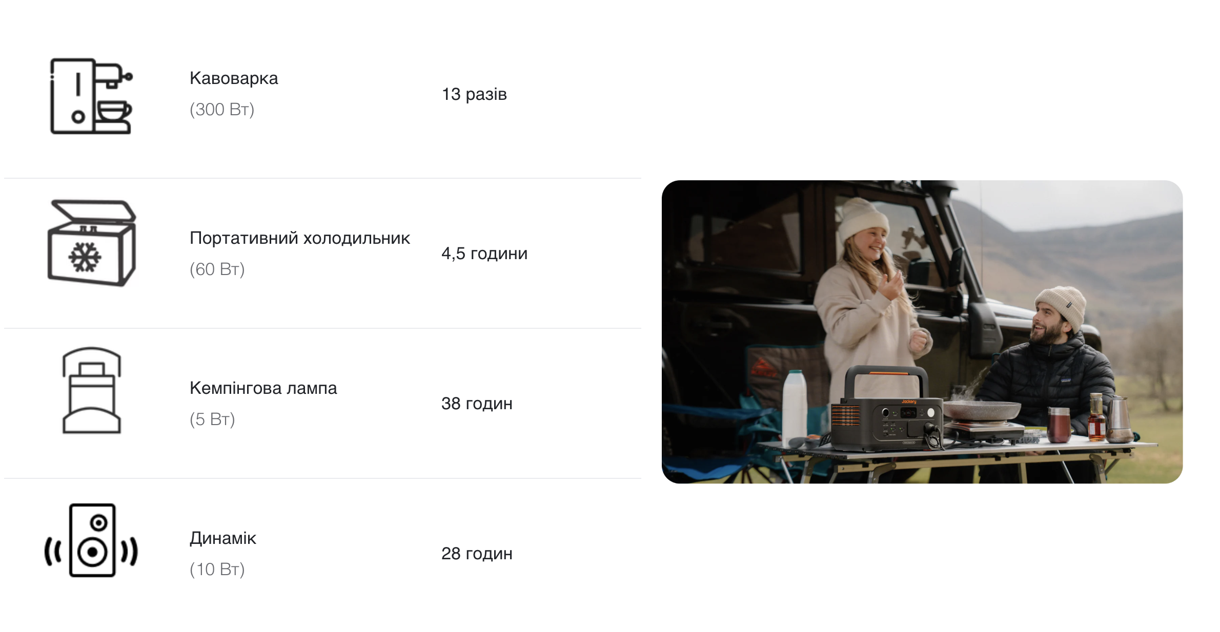 * Години роботи пристрою: дані випробувань, отримані в лабораторії Jackery. Зверніть увагу, що для отримання точних показників продуктивності вирішальне значення має фактичне використання.
