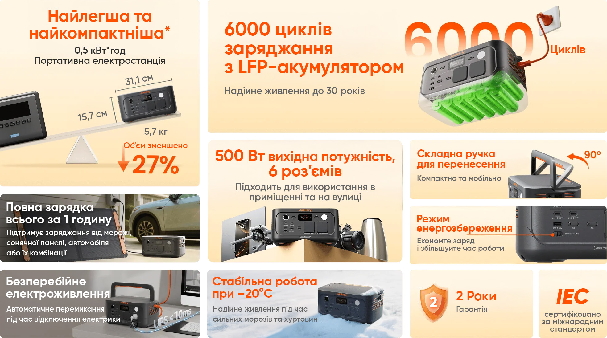 Ємність 512 Вт*г і потужність 500 Вт: ідеально підходить для 1–2-денних кемпінгових пригод або як надійне аварійне джерело живлення вдома. Завдяки 6 виходам електростанція може одночасно живити кілька пристроїв — від смартфона і ноутбука до кемпінгових ліхтарів і холодильників (загальне навантаження до 500 Вт).