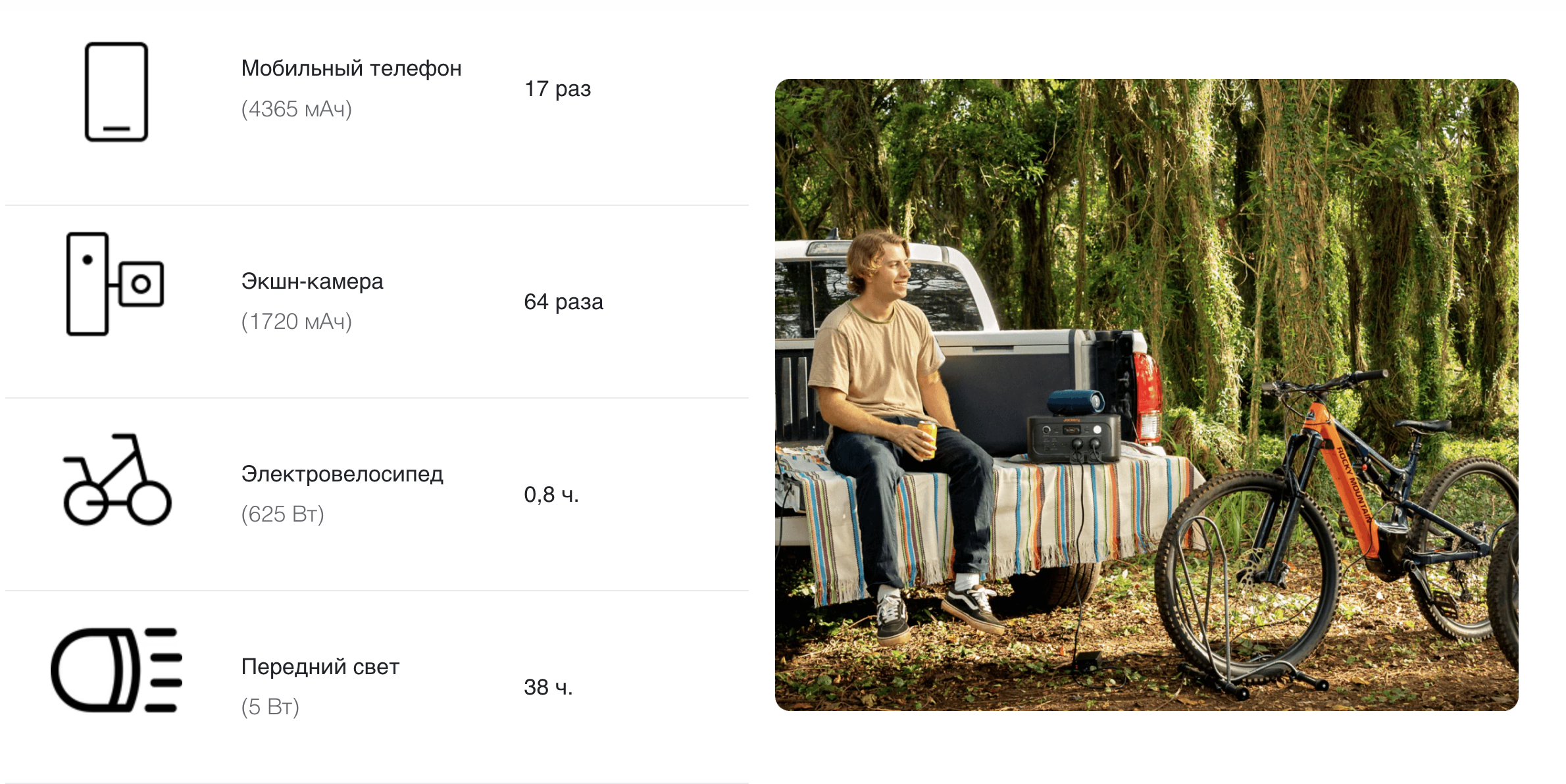 Энергия для мгновений на природеОбеспечьте атмосферное освещение во время вечерних пикников и кемпинга в саду – с надежным питанием для ламп, портативных колонок, мини-вентиляторов или небольшого холодильника. |