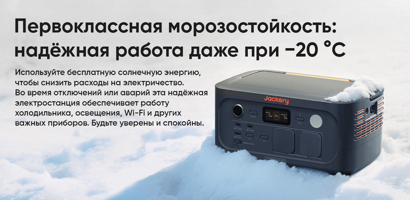 Обеспечьте освещение кемпинговыми фонарями, работу портативного холодильника и зарядку мобильного телефона или ноутбука – будь то солнечный летний уик-энд или короткое зимнее путешествие. Компактный, легкий и надежный Jackery 500 v2 обеспечивает спокойный кемпинг с подключением к сети в любое время года.